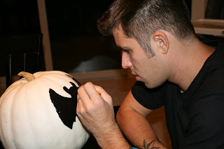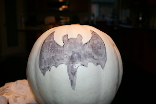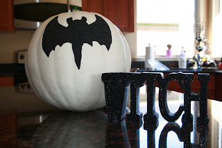 Because I am not the worlds best artist, I picked an easy design (a bat) and drew the outline on the pumpkin with a pencil. If you look close, you can sort of see it in the picture. I outlined the design in black paint and then filled in the rest with a thin coat of paint. I wasn’t too sure what to do next because my paint was super thin. I guess that is what you get for using washable children’s finger paint? My husband, however, actually did have an idea and pretty much pushed me out of the way and took over. He put a ton of paint on the brush and sort of globbed it on, for the lack of a better term. It worked great and he totally saved the day! Does the bat look perfect? Nope, but I love it and it was a super easy project.