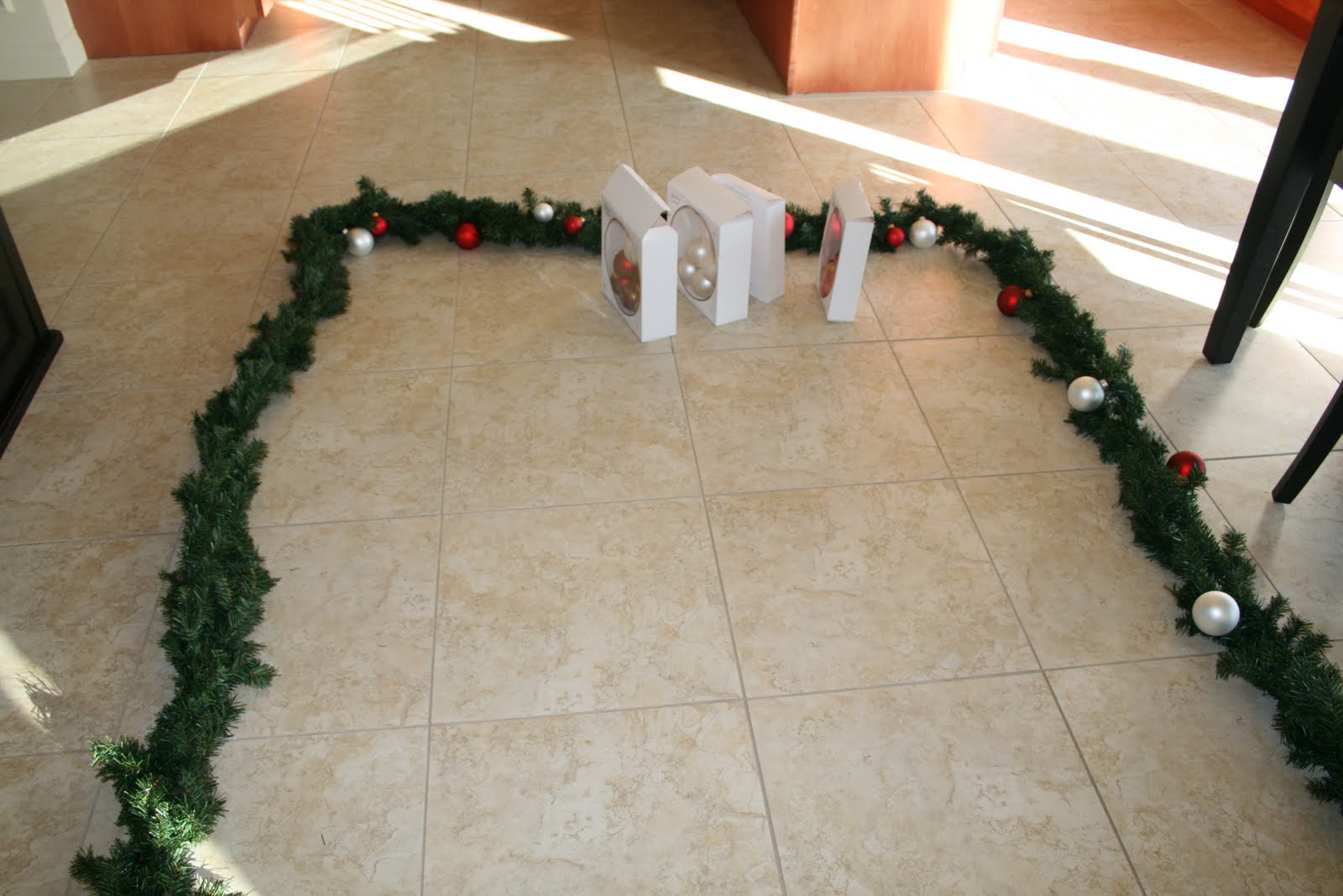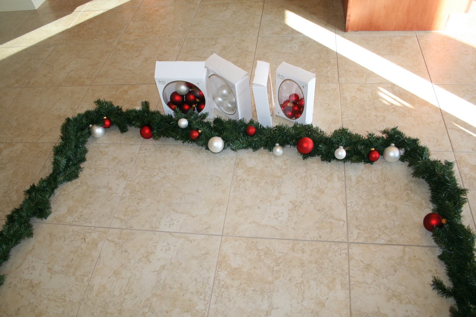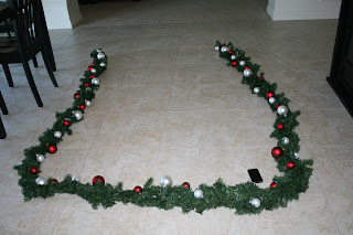 In addition to making the bulb ornament wreath, I also made a garland to hang around the doorway. The fall garland I used was pre-made and just needed to be attached. However, I was unable to find any Christmas garland that I liked, so I ended up making my own. I used the five 9ft. strands of pine (fake) garland from Michaels. The strands are very thin, so I elected to double them up. Just like with the leaf wreath, I just attached the bulbs using ornament hangers and made sure to secure them very tightly.