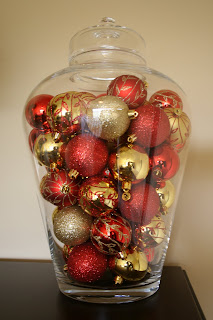 I love the red and gold together! Also, I stole your idea with smaller jars. We found some red beads that I used to wrap around my tree when I was single. I am now going to put them in smaller jars this year and look for better jars next year!