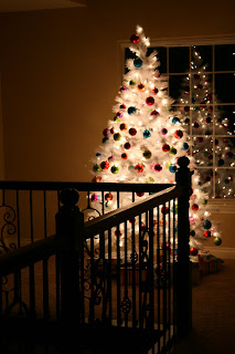 I am not usually a fan of white trees, but I love how you decorated this one and it looks great in your window. We only have one tree. I wanted two but B looked at me like I was crazy. Considering how much trouble we have had keeping Brad out of the one tree, I think B was right.
