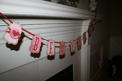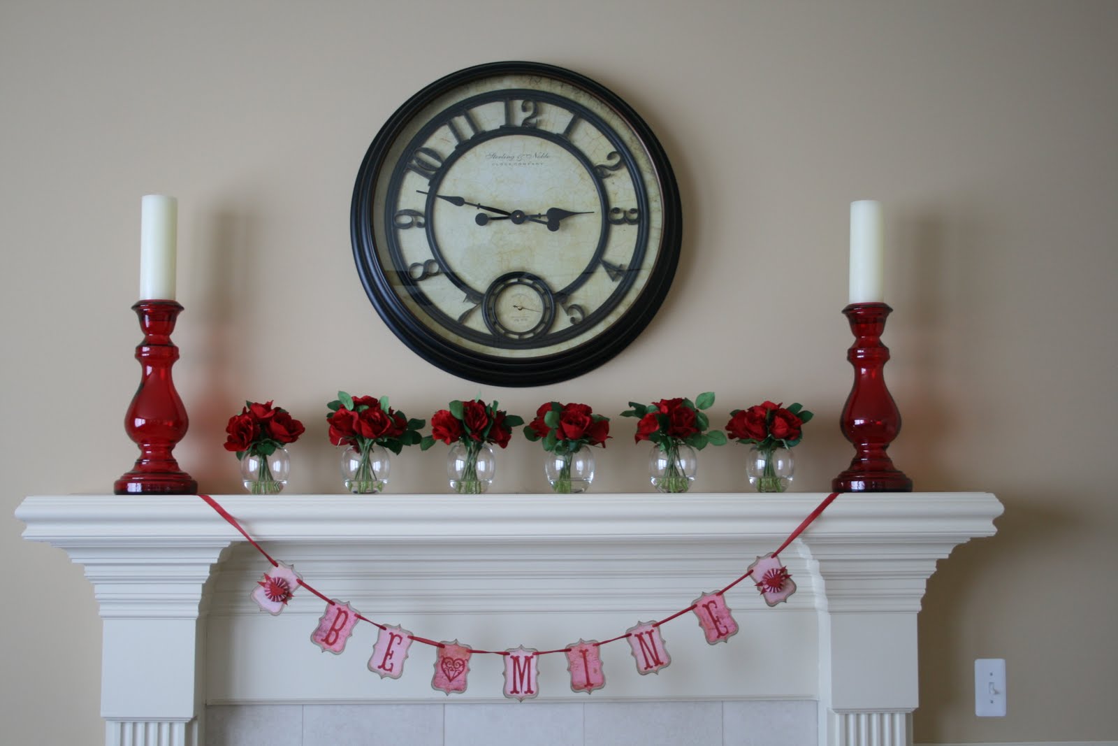I have to admit, I am not the best about keeping my mantle decorated. Christmas time is easy to keep it looking good, but for other seasons, I am often at a loss! I toyed around with a few ideas for Valentine’s Day and ended up with this. The flowers and candle holders are from Pier 1. The banner is from Etsy.