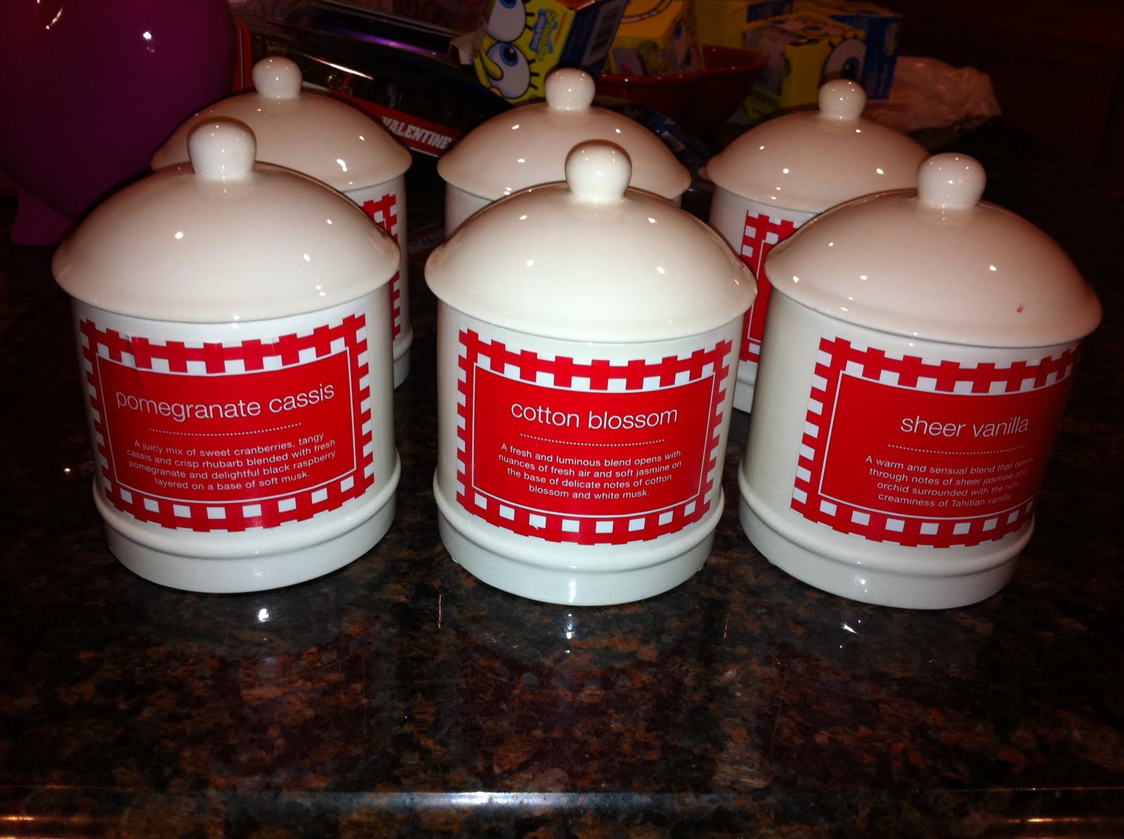 I had heard about some Barbie stuff was that 90% off, so I checked out the “regular” toy aisles and sure enough, I found gift bags, a coffee mug, a travel mug and some cards in a cute tin. Of course, none of it was marked 90% off, but that just makes the hunt more fun! I was also very pleased to find the jar candles! It wasn’t until I was at the second store that I remembered that Target even had candles for Valentine’s Day. I checked out the candle aisle, and sure enough, there they were. Regular price was $6.99, which made them $0.69! Can’t beat that.