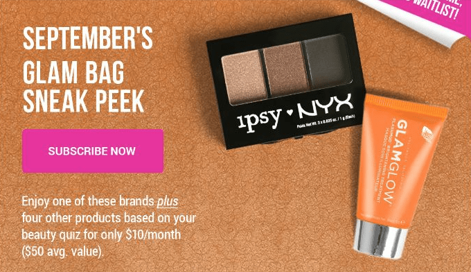 ipsy is $10/month and sends its members a beautiful Glam Bag with 4-6 deluxe samples and full-sized beauty products.