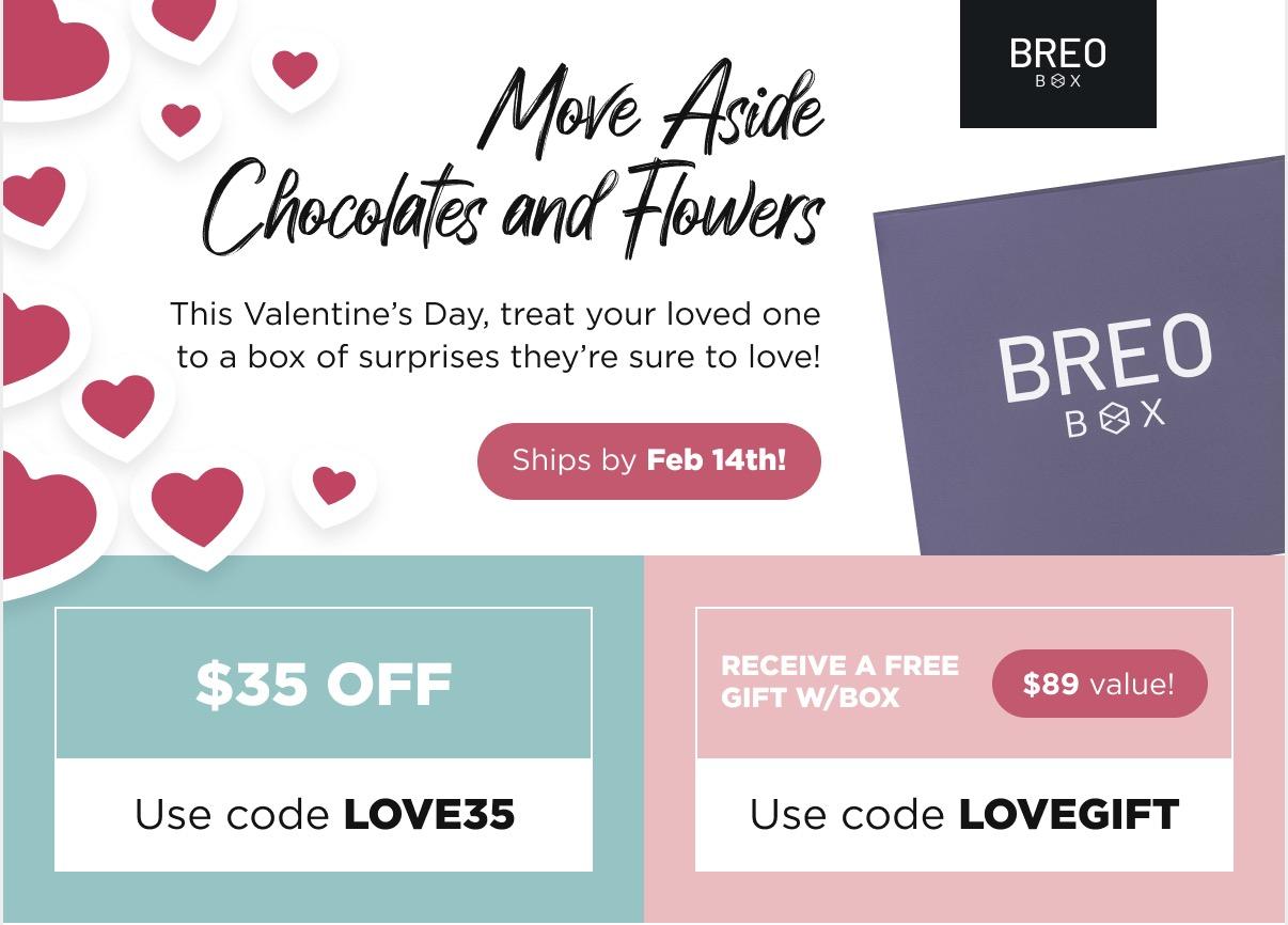 Breo Box is having a Valentine’s Day Sale! New customers can get $35 off your first box or get a FREE gift with purchase. Use coupon code LOVE35 for $50 off or LOVEGIFT to score a free gift.
