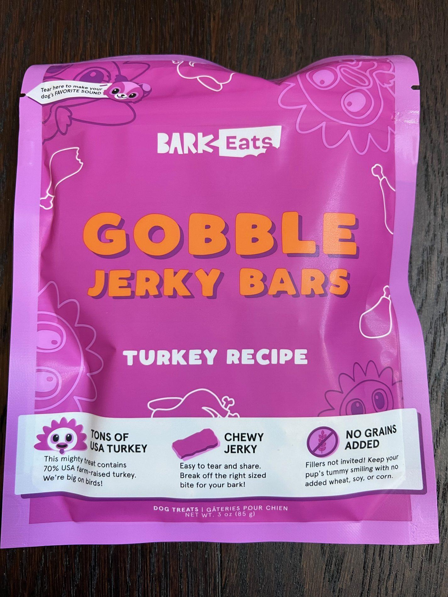 –BarkEATS Gobble Jerky Bars: We have gotten the nibbles versus of these in a previous box and my dogs loved them. They are soft chewy jerky treats and my dogs LOVE them.