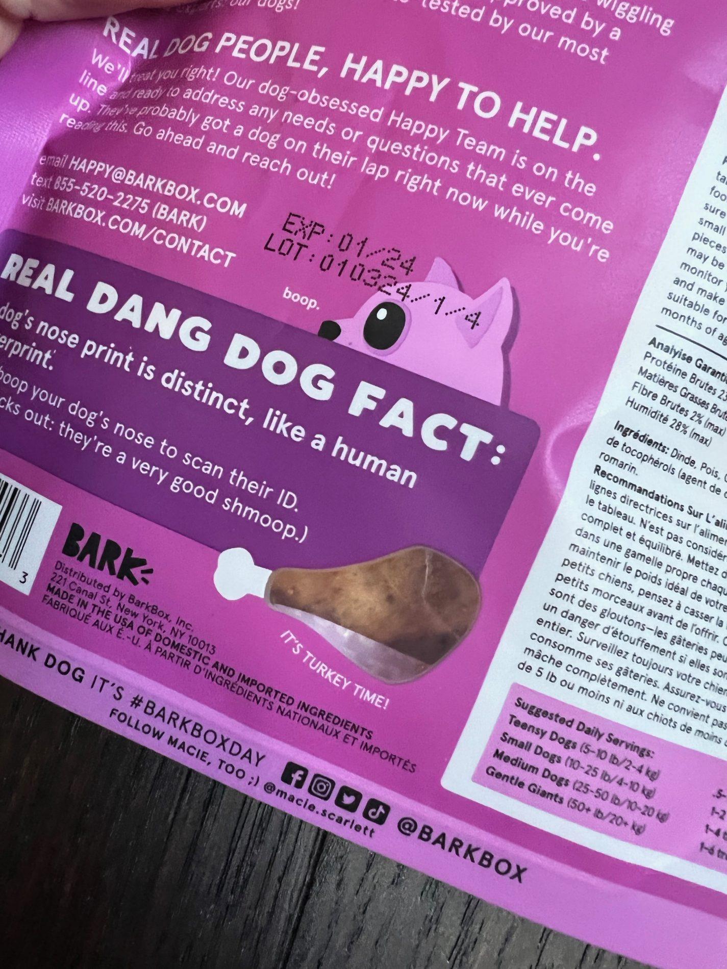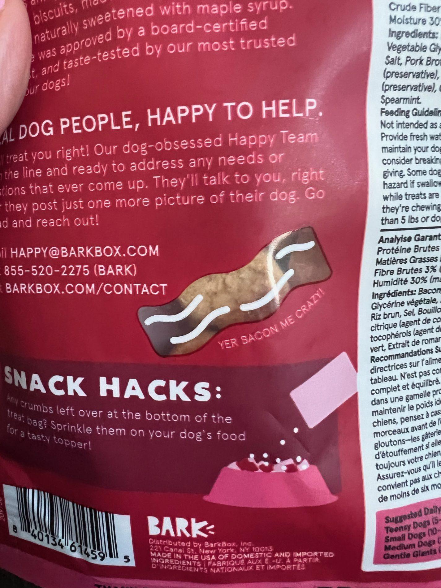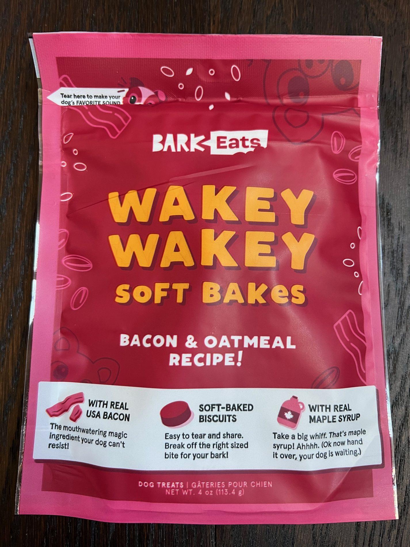 –BarkEATS Wakey Wakey Soft Bakes: We received these in a previous box and my dogs loved them. They are soft-baked biscuit treats made with real bacon. A total crowd favorite.