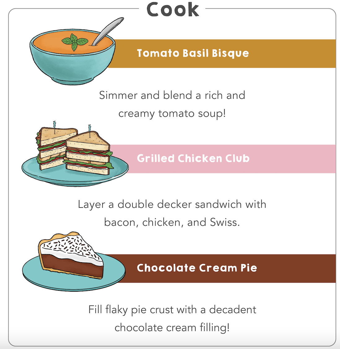 Are you ready to open your own café? With creamy tomato bisque, the perfect chicken club sandwich, and a silky chocolate cream pie, your chef will have a full menu to work with to get orders out.