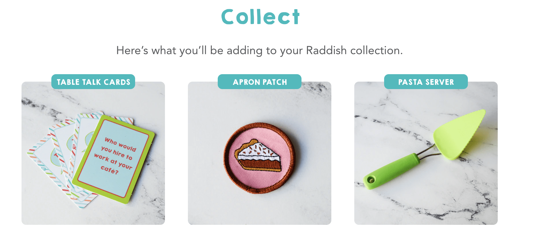Raddish Kids is a monthly subscription box for kids 4 to 14+! Young children ages 4 to 6 can enjoy working alongside an adult in the kitchen. Kids and tweens ages 7 to 12 can explore their culinary curiosity and take on an exciting role preparing family meals. Each box includes, illustrated recipe guides, 3 culinary skill cards, a creative kitchen project, kid-friendly tools and collectibles (see a sample) such as Table Talk cards, a culinary tool, and an iron-on Raddish patch. In addition, you’ll receive a free Raddish apron with the purchase of a 6 or 12-month membership (additional aprons may be purchased during checkout).