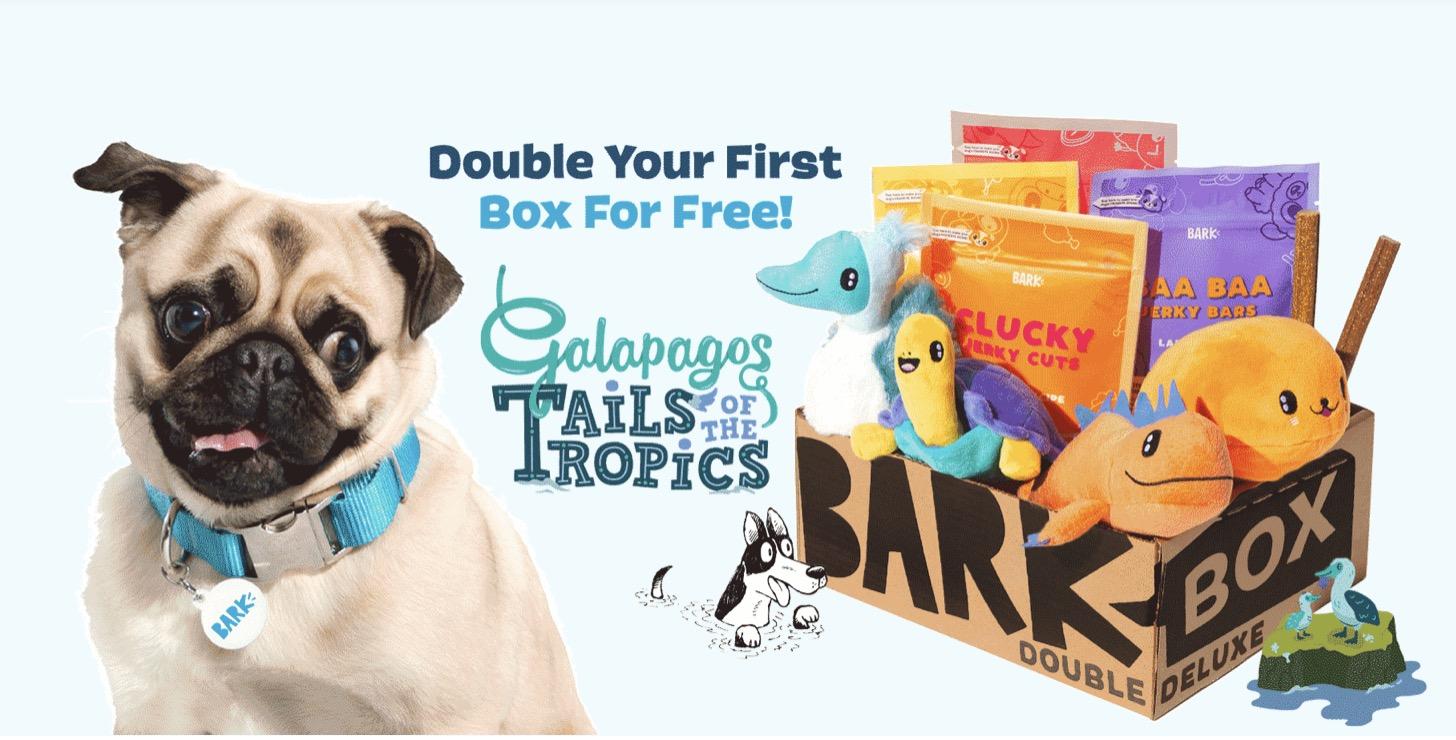 Sign up today for a new 6 or 12-month BarkBox subscription and DOUBLE your BarkBox for FREE plus you will start your subscription with a Galapagos Tails of the Tropics themed box!   No coupon code necessary – just use this link and you will see the offer pop-up.