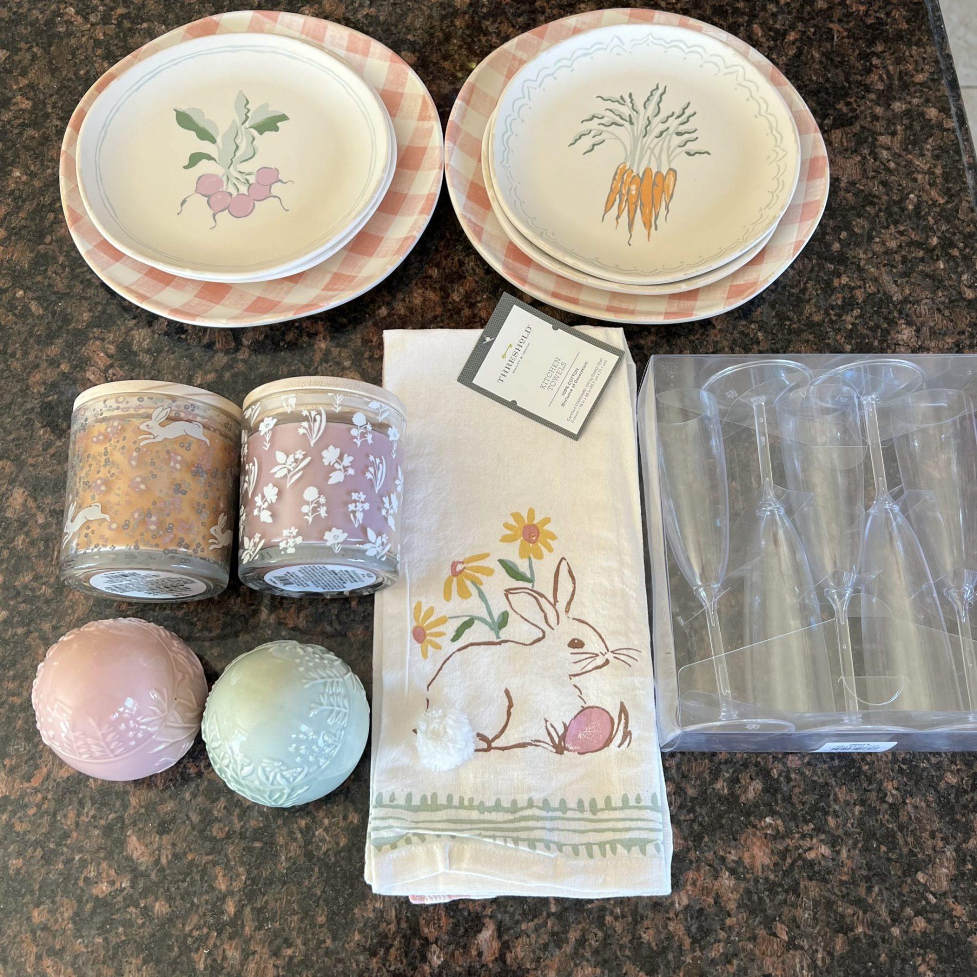 -Have you shopped the Target Easter clearance? I went yesterday (my store was 70% off) and am pretty pleased with my finds. The candles were $3 (reg $10), the plates were $0.90 (reg. $3), the towels were $1.80 (reg. $6) and the champagne glasses (plastic) were $1.80 (reg. $6). I am guessing 90% off everywhere tomorrow. One of my stores was 90% off today, but the other was still 70%.
