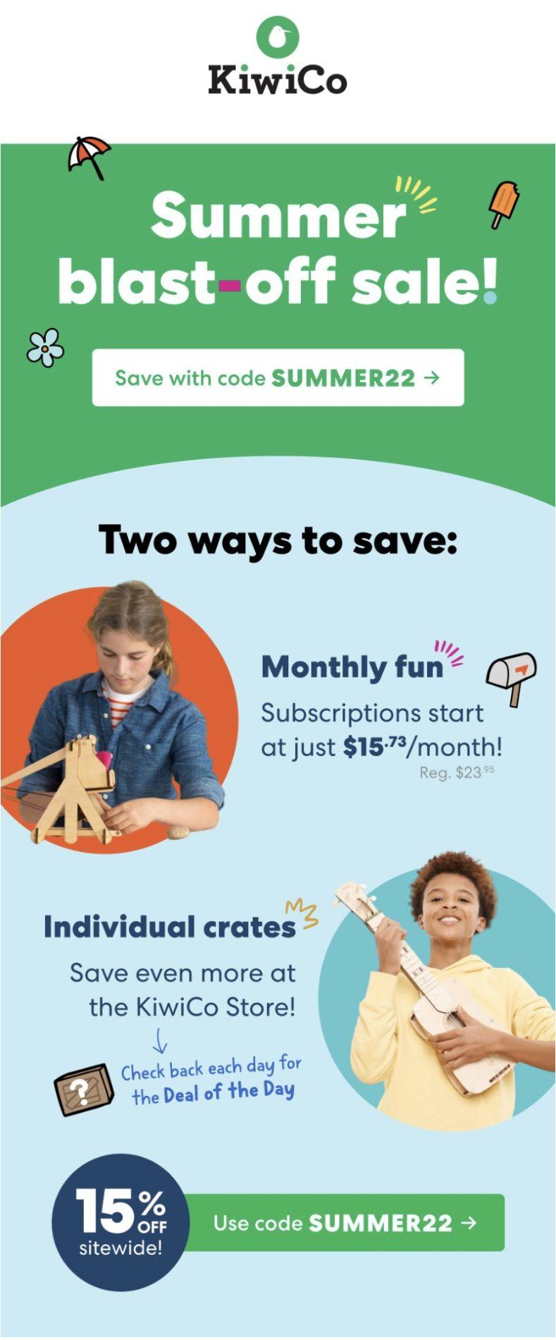 Kiwi Crate is offering new customers 15% off their entire subscription and/or shop purchases for Memorial Day! Use coupon code SUMMER22 at checkout.