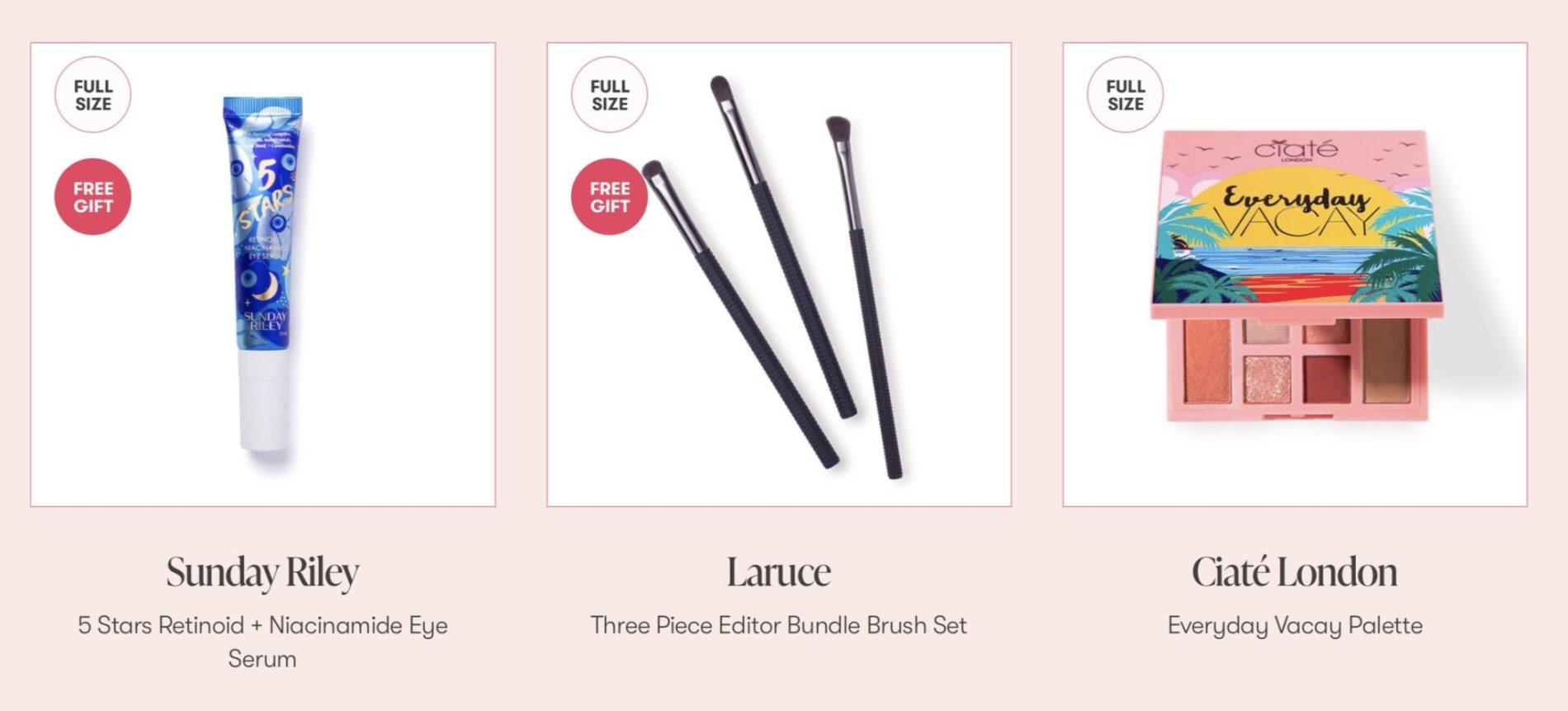 New Allure Beauty Box subscribers can get their first box for $15 plus two free full-sized gifts when they sign up today. Use coupon code VIP15 to get your first box for $15 plus FREE full-size Sunday Riley 5 Stars Retinoid + Niacinamide Eye Serum AND Laruce Three Piece Editor Brush Set!