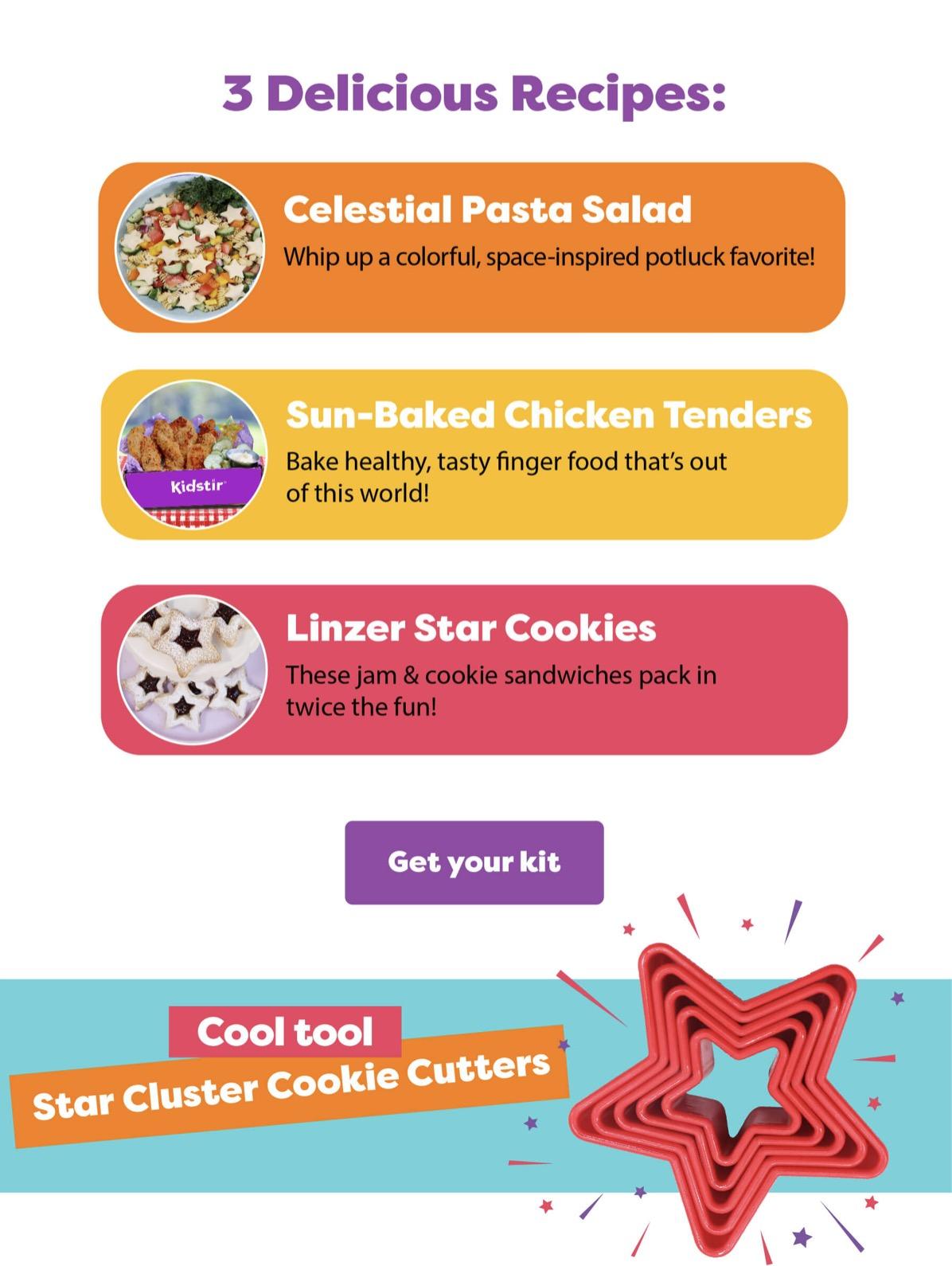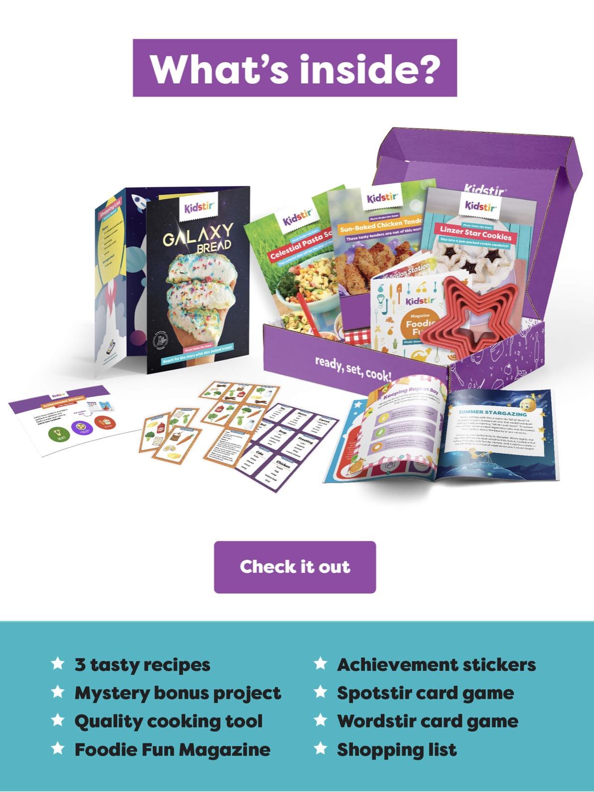 Kidstir sends fun cooking kits to your door every month. All Kidstir kits contain:
