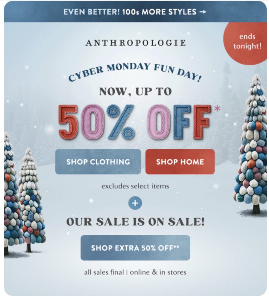 The Anthropologie Cyber Monday sale is here. Use this link to save up to 50% off sitewide – no coupon code needed. Sale items are an additional 50% off.