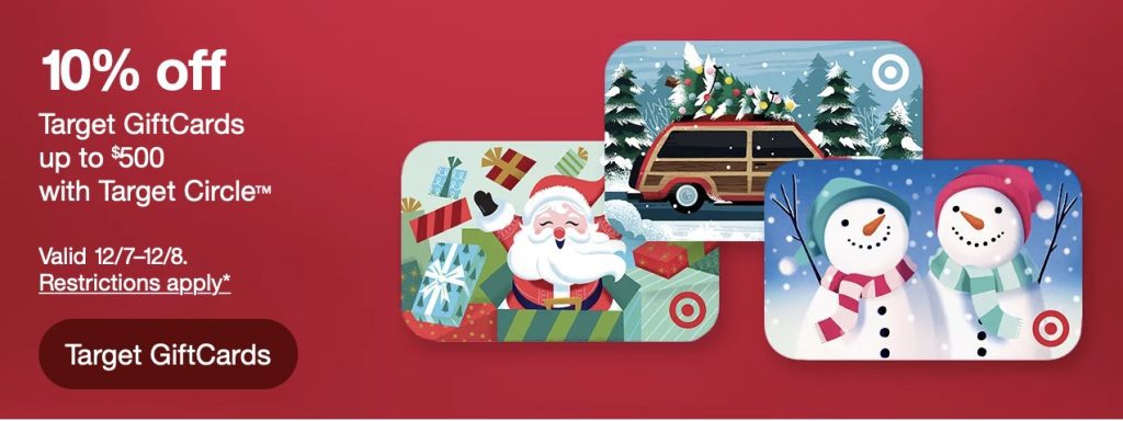 Target is offering 10% off Gift Cards!  This deal is available with Target Circle through Sunday, 12/7! Get them for you, for gifts, for EVERYTHING!