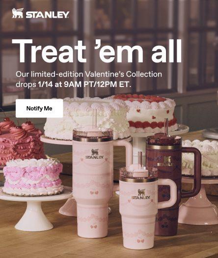 The Stanley Valentine’s Day collection is dropping 1/14/26 on the Stanley website. The collection includes two new designs – Red Velvet Cake and Pink Velvet Cake.